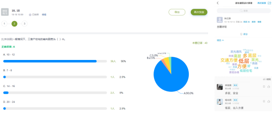 本节课主要学习低层住宅的相关知识,首先利用智慧课堂随堂测验环节检查员工的复习和预习成效,整体效果良好。以常见的居住区住宅类型引入话题,让员工按自己的理解讨论回答问题:“你理想中的居住模式?并说出你觉得其最吸引你的特点是什么?”,词云分析答案最多的为低层住宅,从而引入新课低层住宅设计。接下来从低层住宅的发展史到特点,以及庭院空间的组织利用进行了详细讲解。在低层住宅的发展阶段讲解时,让员工从中国独特而璀璨的民居文化中感到自豪,从浸透着近现代中国屈辱抗争的文化和历史的花园洋房中感受到历史的沉重。