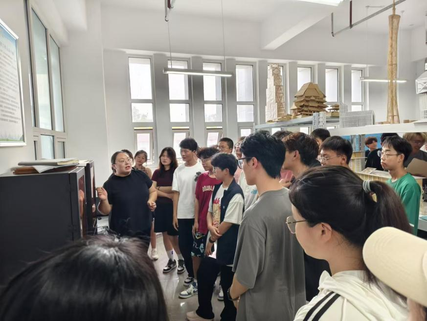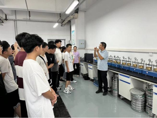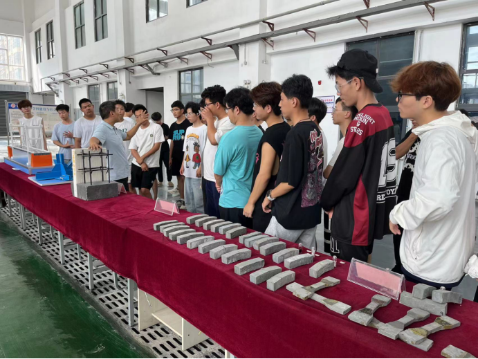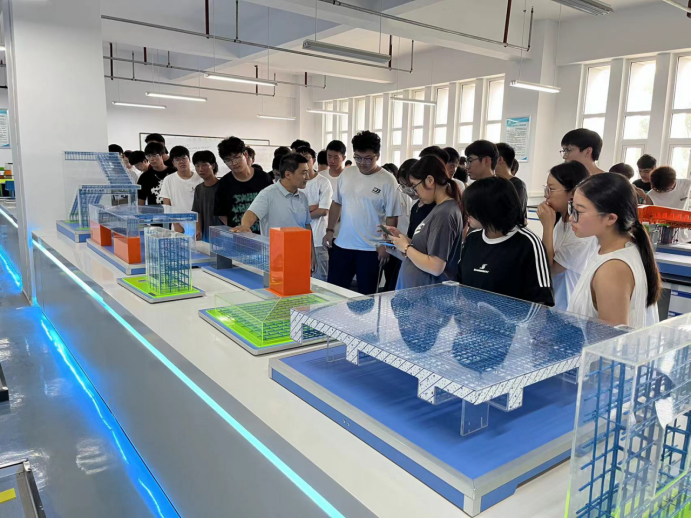 高永辉在结构大厅向同学们介绍新型建筑材料及其应用;在结构模型室,向同学们介绍节点模型构造,帮助员工认识并了解模型名称及构造原理;介绍框架结构体系梁柱基本构造原理,帮助大家建立建筑结构体系的认知,简单了解梁柱基本结构体系的内容;在建筑材料实验室,向同学们介绍各种建筑材料的检测检验仪器,帮助大家简单了解建筑材料的基本性能及检验方法。
