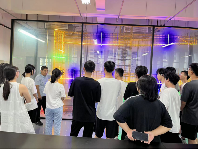 戚瑷娜带领同学们参观楼宇智能化工程实训系统。实训装置模拟了实际的建筑场景,为员工提供了接近工程现场的实训环境。同时向同学们介绍了楼宇智能化设备监控系统,让他们了解先进的传感器技术、自动化控制技术和通信技术是如何实现对楼宇设备的实时监测、控制和优化管理的。