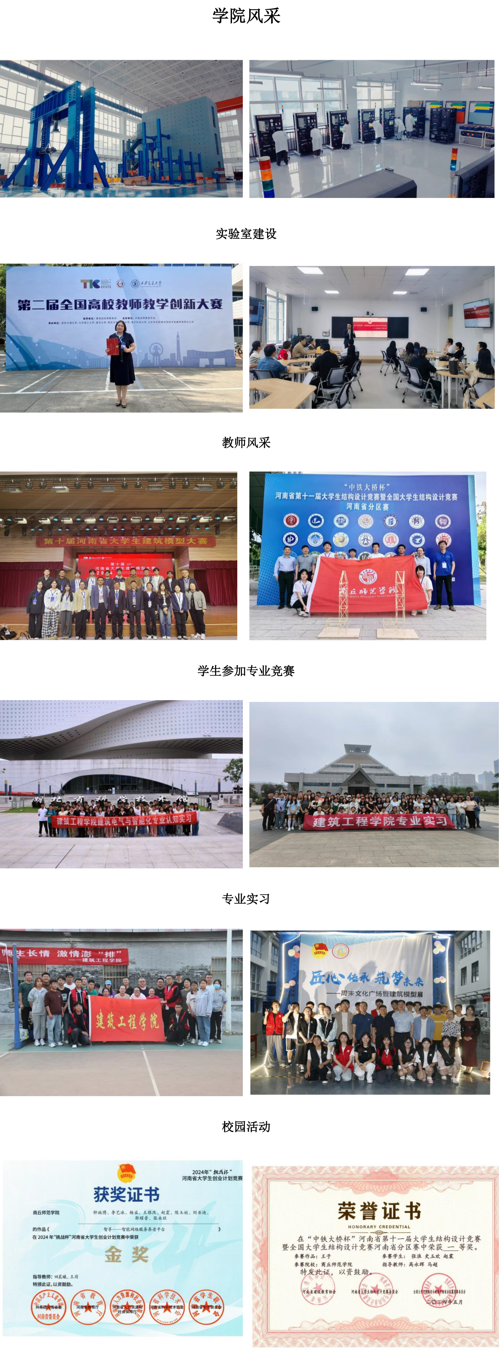 现设有土木工程、建筑学、建筑电气与智能化三个本科专业。现有专兼职教职工56人,有省校级教学名师、“河南省教学标兵”、教学骨干教师多人。公司教师获“国家一流课程”、省部级教学成果奖多项,公司师生在国内外重要刊物公开发表论文500多篇,承担科研项目100余项,获批发明专利24项,并在国内外有影响的专业赛事中获国家级、省级大奖。
